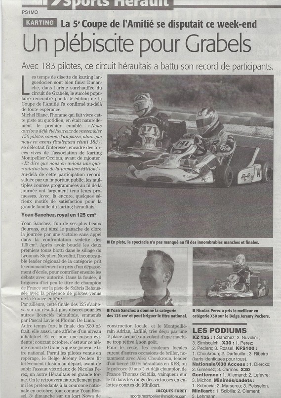 Thibaut CLEMENT en catégorie Minikart, monte sur la 2ème marche du podium après avoir réalisé la pôle position des essais chronométrés et dominé la finale jusqu'à l'avant dernier tour ! Il termine à 143 millièmes de seconde du premier, Thomas Scibilia, Champion de France en titre. Thibaut confirme ainsi sa prestation de la Coupe de France 2011 où il avait fini 9ème et avait réalisé le meilleur temps en course en finale. Il pointe actuellement à la 2ème place du Championnat Régional toujours derrière Thomas Scibilia. La dernière course à Ganges les 5 & 6 novembre prochains sera déterminante. Nul doute que Thibaut mettra tout en œuvre pour la gagner et peut-être ainsi être sacré Champion Régional 2011.